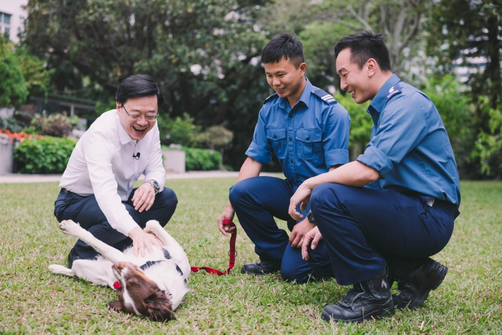李家超形容Twix、Umi和Uma活泼好动,当牠们到达礼宾府草地时显得非常兴奋,其中Twix更向大家翻肚讨摸,可爱的样子哄得大家十分开心。他又指狗狗是人类的好朋友,亦是大家合作无间的工作拍档,目前本港纪律部队共有接近340隻工作犬,协助部门人员执行各项与维护法纪和保障大众安全有关的职务,包括巡逻、调查、缉毒、搜索等工作,希望借此机会答谢一直默默守护城市治安的领犬员们和狗狗。