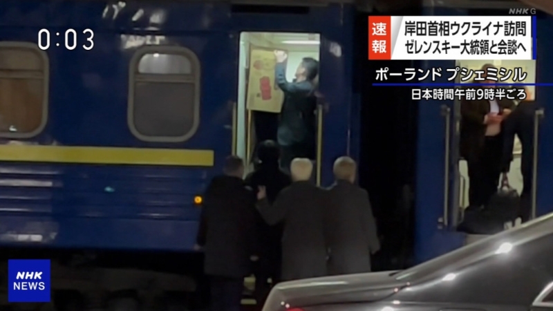 ▲岸田文雄访问乌克兰画面出现“美味棒”纸箱引发热议。 NHK截图
