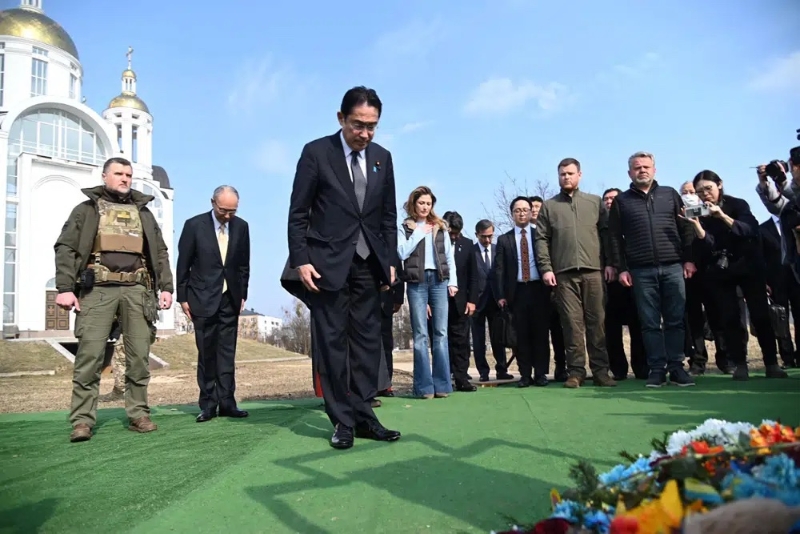 ▲岸田文雄于基辅市郊布查镇,向被俄军杀害的罹难者致哀。美联社