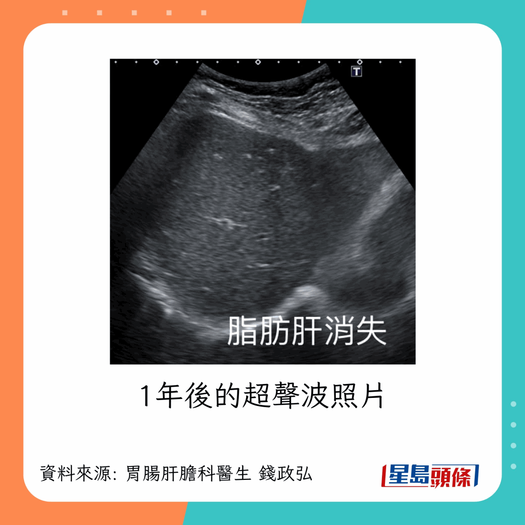 台湾胃肠肝胆科医生钱政弘在Facebook专页分享肝脏超声波的照片指,该名女子2022年曾进行检查,当时她的体重为66公斤,而且因为血糖上升导致有长期高血压问题,并发现有中度脂肪肝。然而,当女子于数日前再度覆诊检查时,钱医生却发现她的肝脏已恢复到正常状态,脂肪完全消失,而且体重减少接近10公斤。
