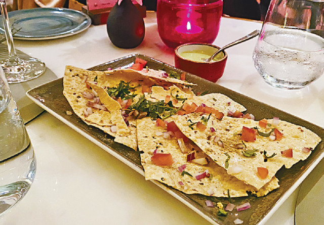 是夜相约三数中外好友共晋晚餐,餐前小食Amuse Bouche率先送上,香口惹味的印度扁豆饺子,紧接着是Marsala Papadum烤香料脆饼(HK$48),纸薄香脆,散发香料和辣椒香气,配合上层洋葱和番茄粒增添口感。 接下来的Tawa Salmon(HK$188),三文鱼柳先经印度综合香料和香蒜姜蓉预腌,再以Tawa印度式平底锅将之烤至香脆。 至于Murgh Tikka Methi Malai(HK$178),胡芦巴鸡肉串不但肉汁丰富,且口感Creamy,附微丝大蒜焦香和Fenugreek胡芦巴独特的微涩、焦甜和朴实香气,用时醮上薄荷奶酪酱汁添润滑口感。