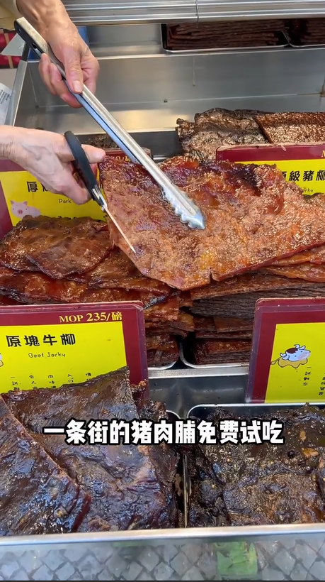 ▲大三巴附近的手信街猪肉干免费试食。