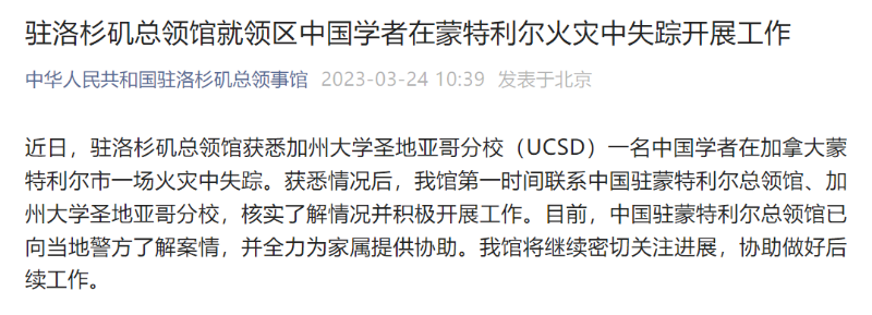 3月24日,驻洛杉矶总领馆发布“就领区中国学者在蒙特利尔火灾中失踪开展工作”的通告。