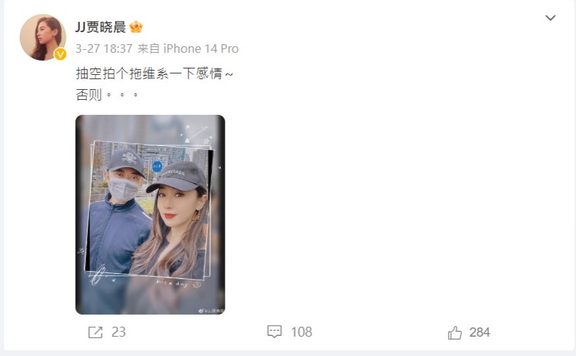 ▲贾晓晨留言:“抽空拍个拖维系一下感情”,似意有所指。