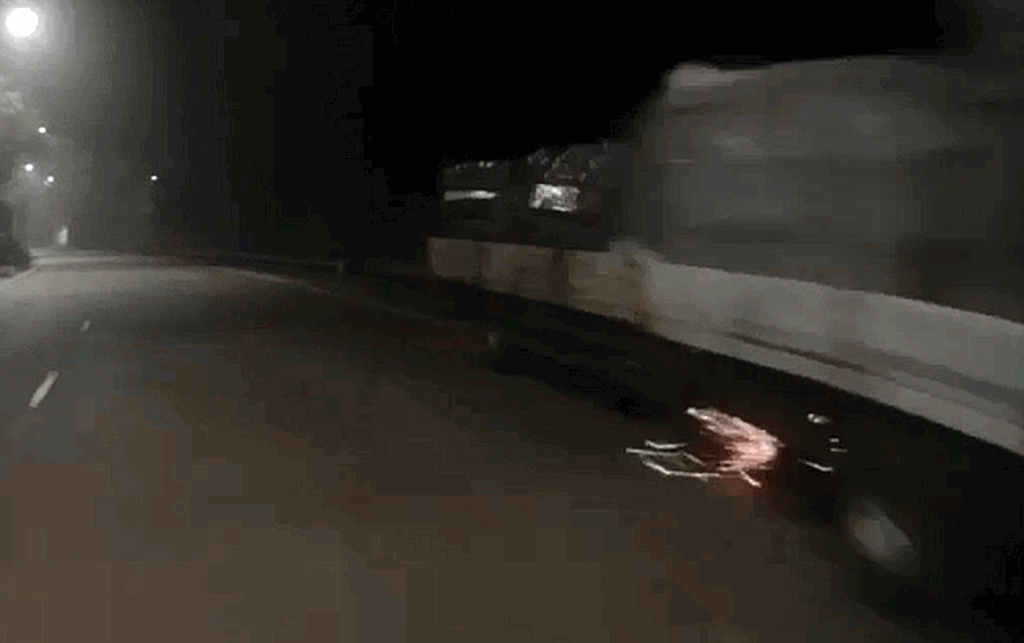 第一条片全长12秒,拍摄时间标明是今日凌晨4时20分,片中一辆开斗货车沿北大屿山公路慢线往机场方向行驶,其间追撞前面一辆开斗货车,相撞时碎片飞出,硬物与马路磨擦溅起星火,前面货车失控移向中线,后面货车则驶向快线并冒烟。