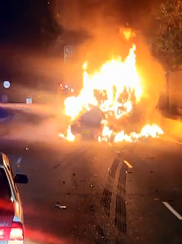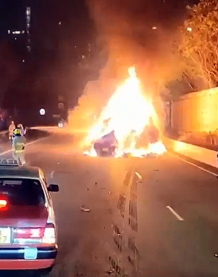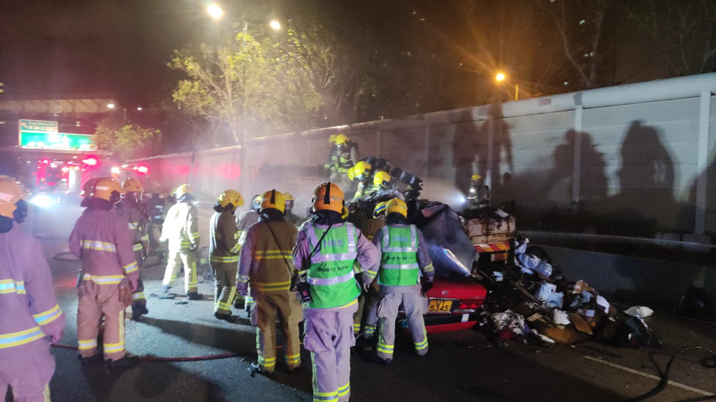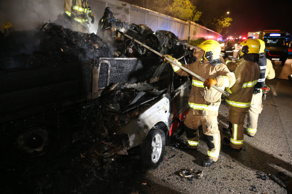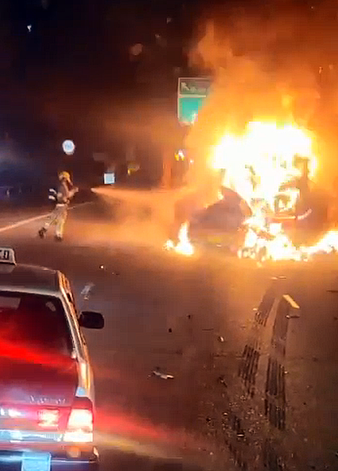 北大屿山公路发生致命交通意外,一名司机当场烧死。今(30日)凌晨时分,一辆货车沿北大屿山公路往机场方向行驶,其间与前方一辆货车相撞。意外后,两辆货车停于公路快线。其后一辆的士驶至,的士直插货车车尾,的士车头起火,火舌烧着货车上货物,的士司机当场被烧死。