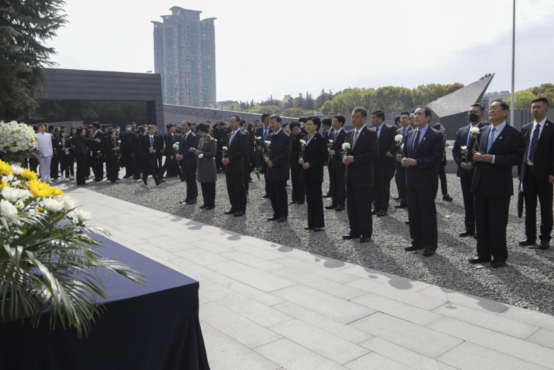 ▲马英九到访南京大屠杀纪念馆,献花和奠祭。美联社