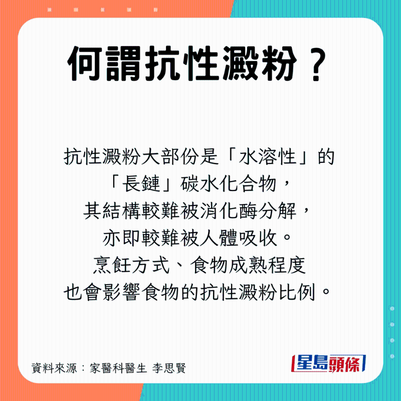 家医科医生李思贤在其facebook专页发文指,用1种方法处理淀粉类食物后,可增加食物的抗性淀粉(resistant starch),可延长饱肚感、稳定血糖。何谓抗性淀粉?抗性淀粉大部份是“水溶性”的“长链”碳水化合物,其结构较难被消化酶分解,亦即较难被人体吸收。