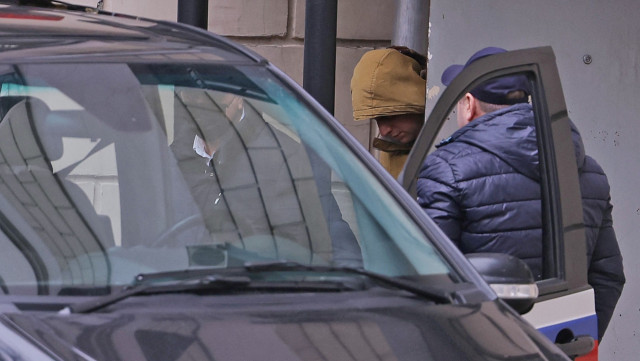 ▲格斯科维奇(Evan Gershkovich)离开莫斯科的法庭,被带上一辆黑色车。 路透社