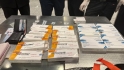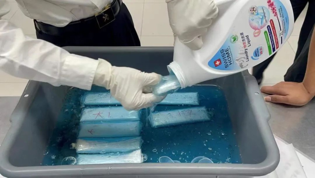 ▲内地关员经检查后,发现两樽洗衣液里共有13条塑胶包装物体。内地海关图片