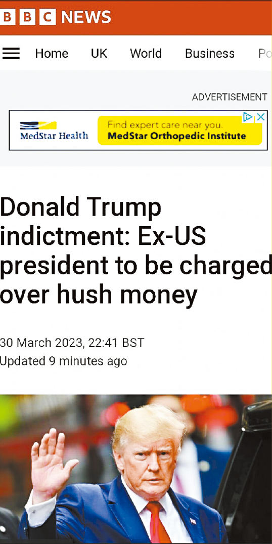 ▲前总统特朗普被起诉事件轰动全球,世界各地报章纷纷大篇幅报道。 英国广播公司网站主页的标题是,美国前总统特朗普因支付掩口费而被起诉。 BBC截图