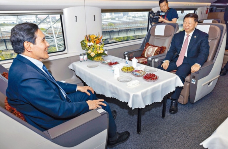 ▲马英九(左)在宋涛(右)陪同下乘高铁前往长沙。