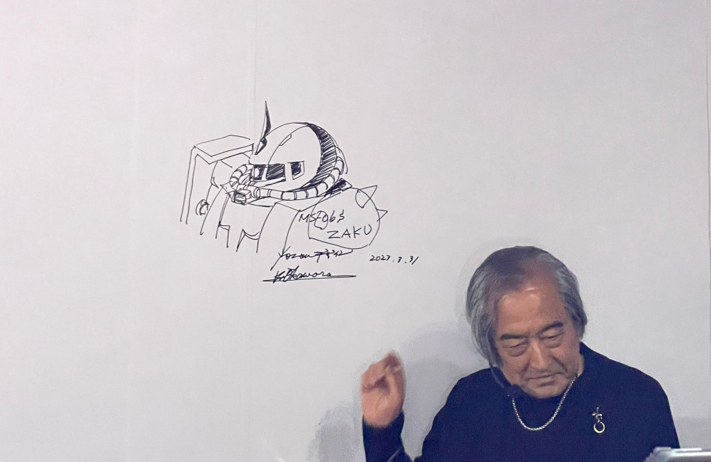 ▲大河原邦男老师在以 120 个 MS-06 渣古 II 头组成的艺术墙即席创作及签名。图片来源:亲子王