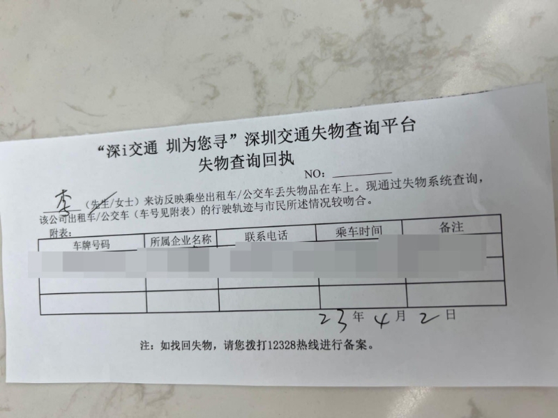 其后事主在警员的建议下,再次搭乘的士到深圳交通失物查询平台。在填表交代资料后,柜台职员仅用5分钟就找到司机,而且还帮忙致电对方。司机20分钟后将行李送返,更贴心地将事主带回原来的目的地。经历一波三折,事主最终失而复得,事情也总算告一段落。