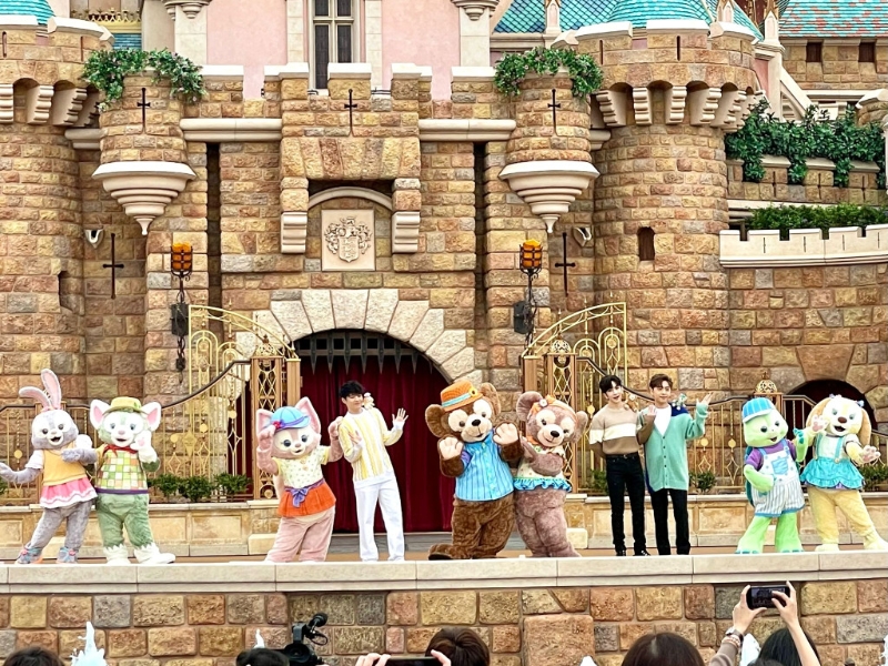 同时园内各处都换上Duffy与好友装饰,附近更不时会有工作人员,用水及扫把在地上画出Duffy与好友地画,想打卡的朋友可到小镇大街碰碰运气!