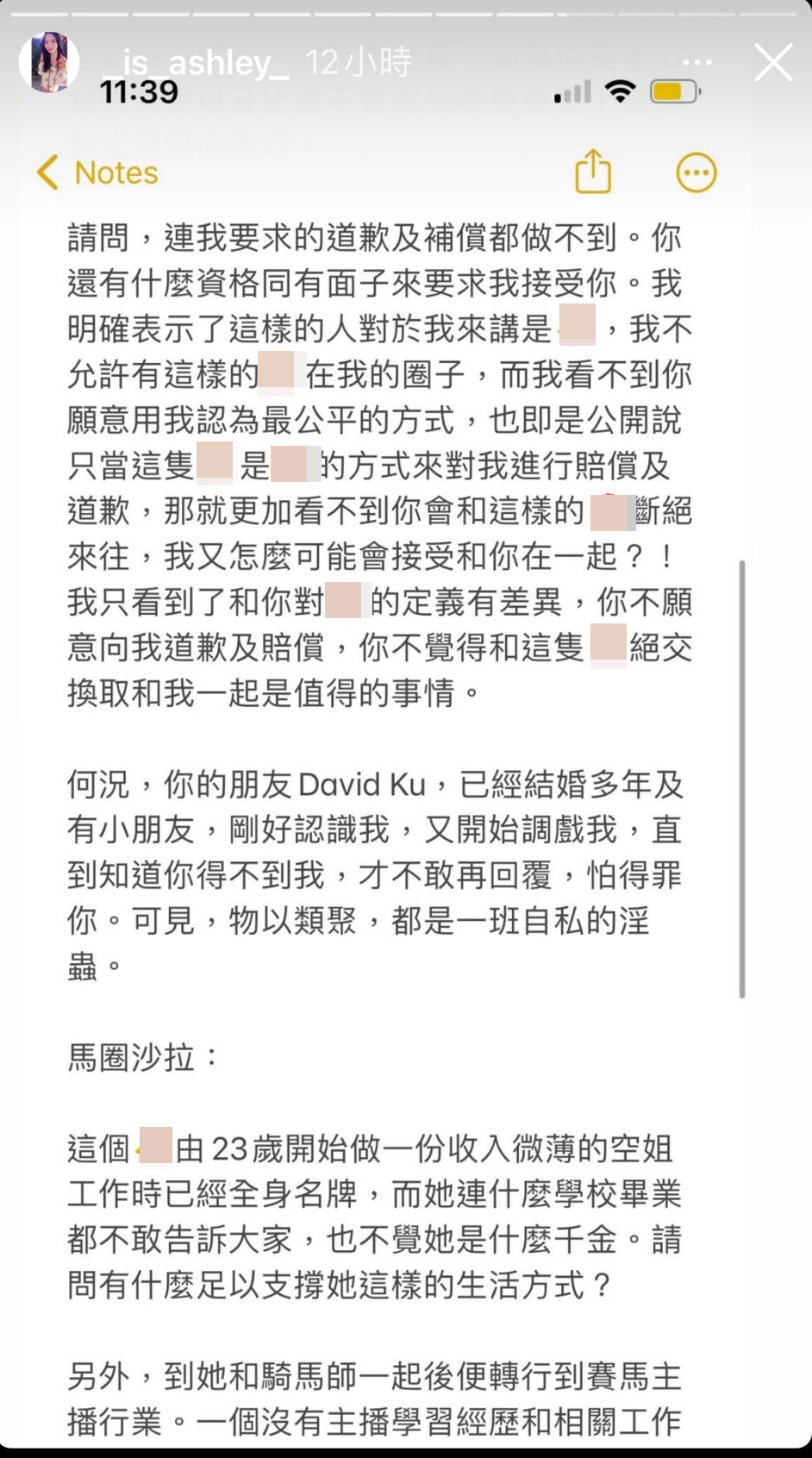 ▲网红人妻Ashley,在IG限时动态出po狂轰钟培生,亦对准“马圈女神”莎拉开火!
