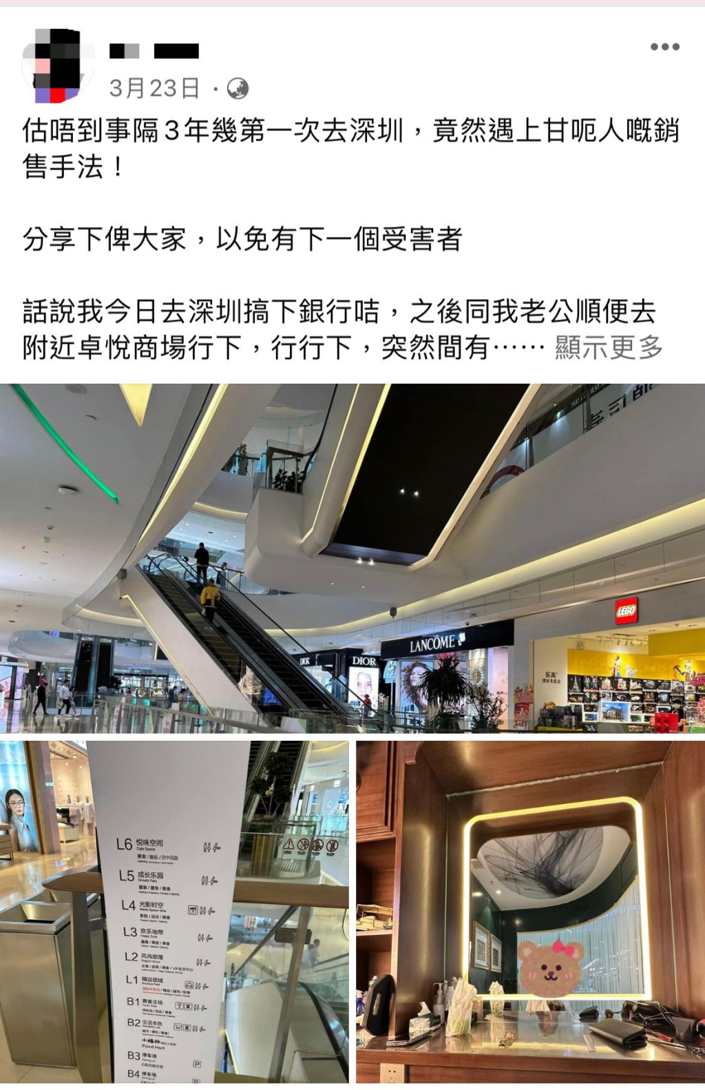 早前有位港妇在Facebook群组“深圳大湾区吃喝玩乐开心分享区”发帖,以“估唔到事隔3年几第一次去深圳,竟然遇上甘呃人嘅销售手法! ”为题,甫开首明言“分享下俾大家,以免有下一个受害者”。