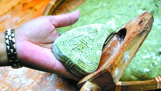 ▲制作鸡屎藤饼时用饼模给粉团定型。