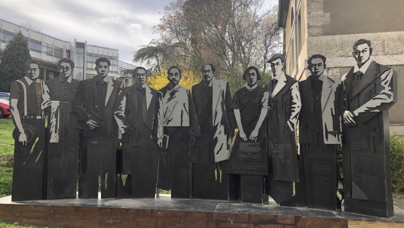 ▲中法大学旧址有多名中国学者塑像,包括学校奠基人之一蔡元培、学校培养的中国人才常书鸿、戴望舒等。