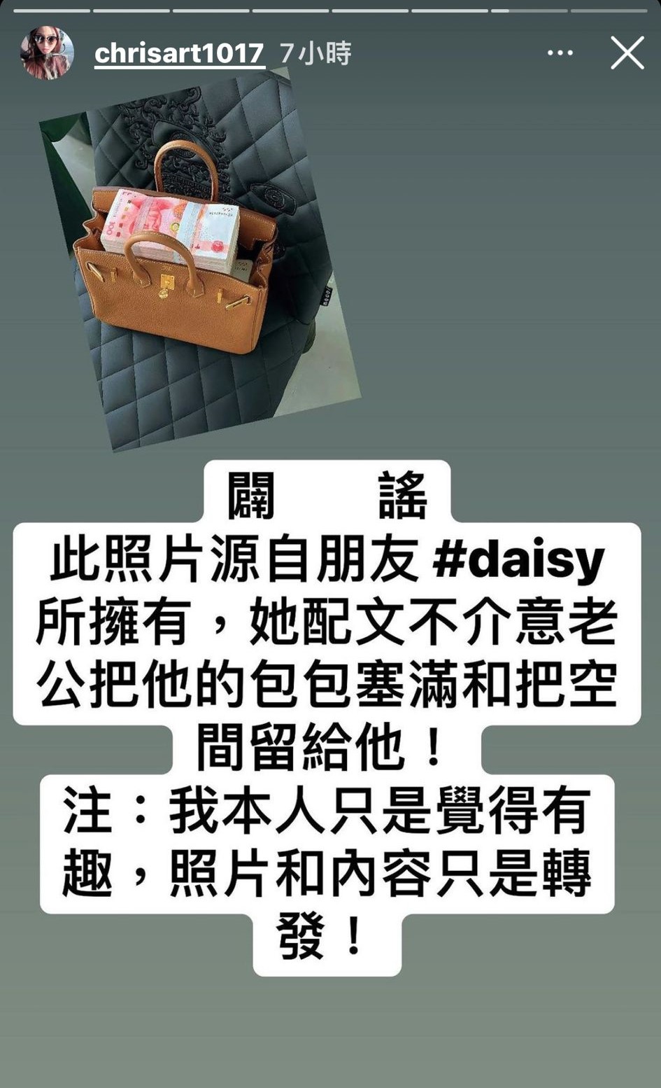 Chris对于分享的照片引起大众误会,亦于IG限时动态澄清:“此照片源自朋友daisy所拥有,她配文不介意老公把他的包包塞满和把空间留给他!注:我本人只是觉得有趣,照片和内容只是转发!”对于照片引起如此大的反应,她也表示:“之前的配文图片动态转载自朋友的,纯属觉得配图和文字有趣转发在个人动态上,没想到造成如此大的误会,实属抱歉。”