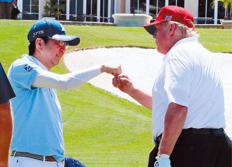 ▲前总统特朗普与日本前首相安倍晋三,曾经一起打高尔夫球,特朗普突然在社交媒体留言,表示“发现”安倍晋三赠送的高尔夫球杆,称出任总统前收到这份礼物。 日本内阁公关办公室图片