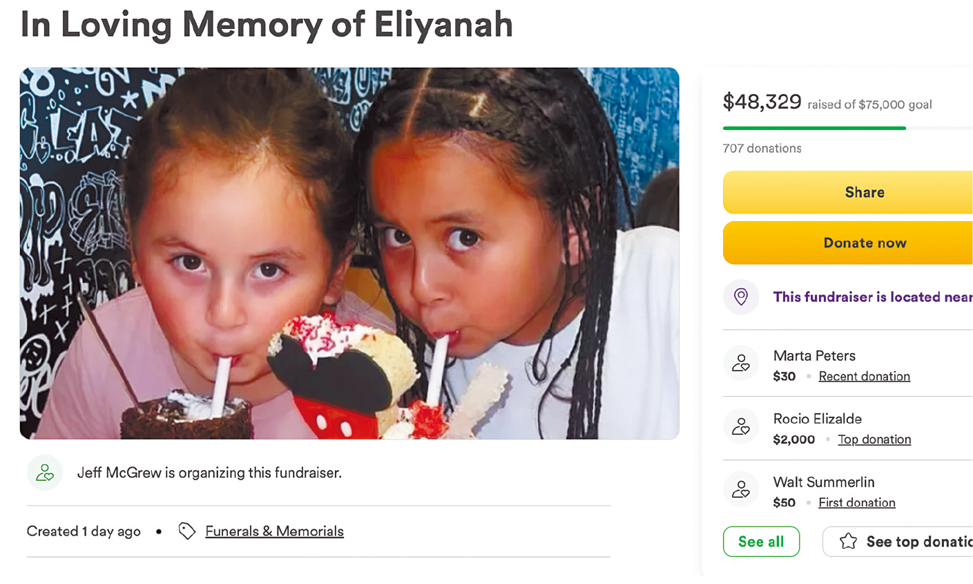 ▲5岁女童中枪亡,亲友发起网络众筹。GoFundMe截屏