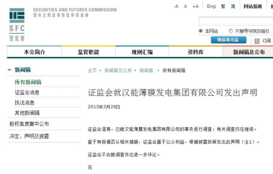 2015年5月28日,香港证监会发表声明称,已就汉能薄膜发电的事务进行调查。2015年7月15日,汉能薄膜发电遭香港证监会勒令停牌。