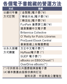 据了解,现时公共图书馆共有14个电子书馆藏,惟各个馆藏购置和订阅方法有别(见表)。14个电子书馆藏中,只有9个可供公共图书馆拣选电子书,其中4个服务供货商更掌握订定电子书复本数量的主导权。然而,上述问题牵涉的HyRead电子书以永久授权方式购置,基本上跟实体书一样是按量采购,揭示署方未有持续检视电子书的使用情况,购置更多额外复本。