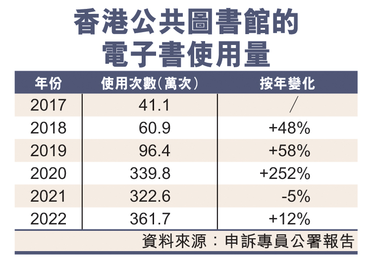 香港文学创作市场由实体书主导,然而疫情期间,公共图书馆因应防疫数度“闭馆”,市民对电子书的需求按倍数增长(见表),部分书籍的预约人数及轮候时间持续高企。申诉专员公署日前发表的《康乐及文化事务署公共图书馆电子书借阅服务》调查报告提到,疫下曾有近400名读者轮候预约1本HyRead电子书,在只有1个复本的情况下,估计最长轮候时间超过5年,及后康文署虽然有增购复本,力臻完善书本流转,惟读者最终仍然要轮候约1个月时间。