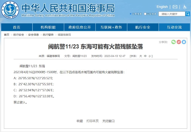 中国海事局网站消息,4月13日,福建海事局发布航行警告:16日9时至15时,在东海以下四点连线水域范围内可能有火箭残骸坠落,禁止驶入。