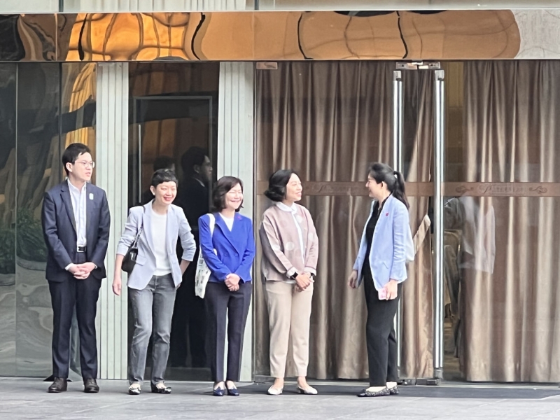 ▲民政及青年事务局局长麦美娟(右二)在酒楼外迎接。 郭咏欣摄