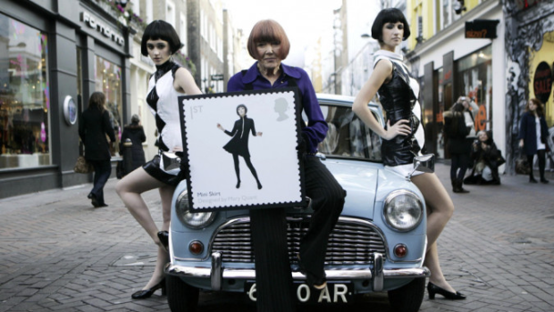 ▲2009年Mary Quant手持英国皇家邮政发行的迷你裙装邮票放大版在伦敦街头留影。美联社