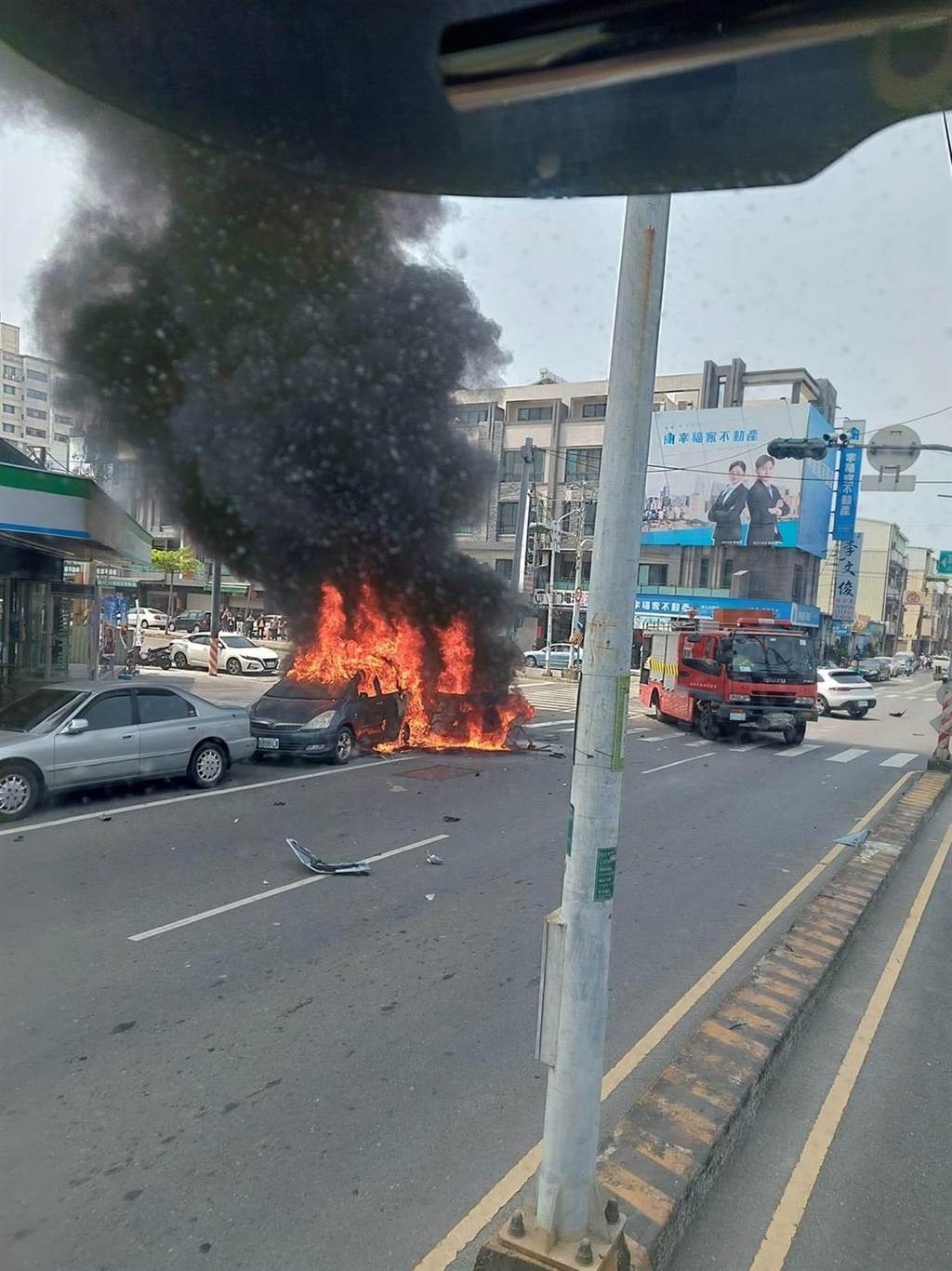 ▲善化区一辆小客车与白色保时捷相撞后喷飞,再撞上路边车辆起火燃烧。 读者提供