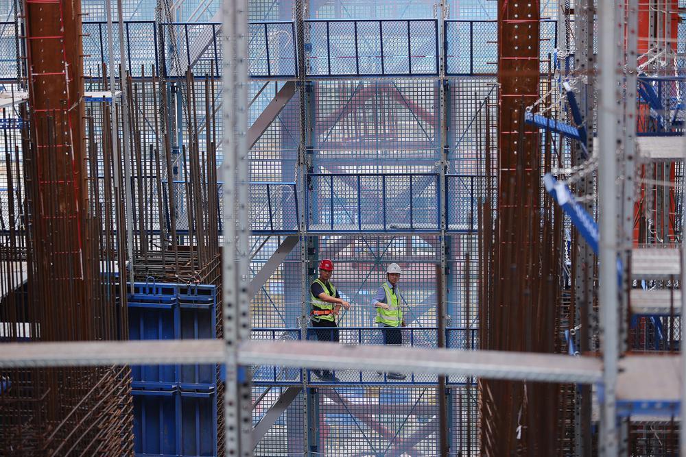 ▲工人在造楼机内部安装配件