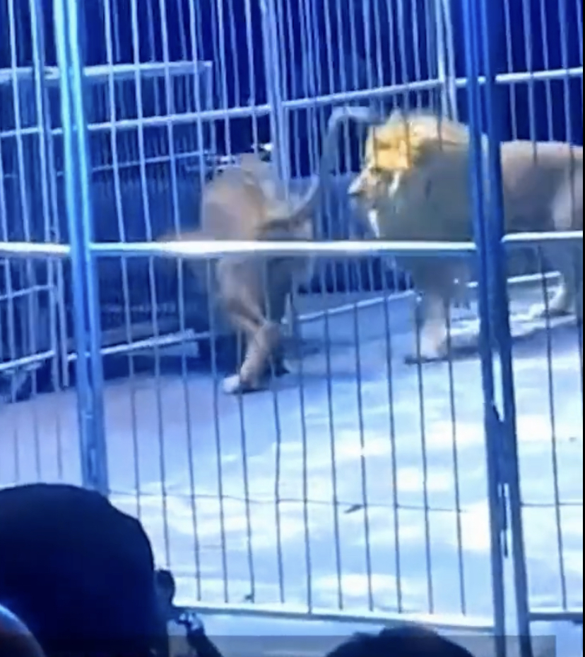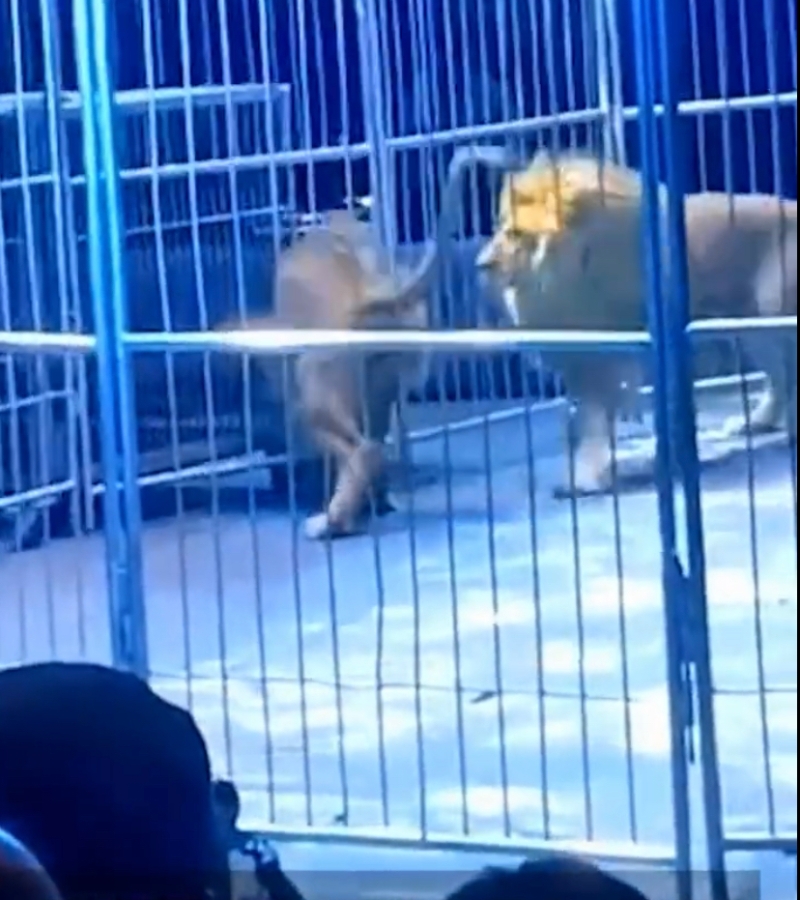 有现场观众说,表演途中2头狮子表现得比较暴躁,笼子也没有关好。