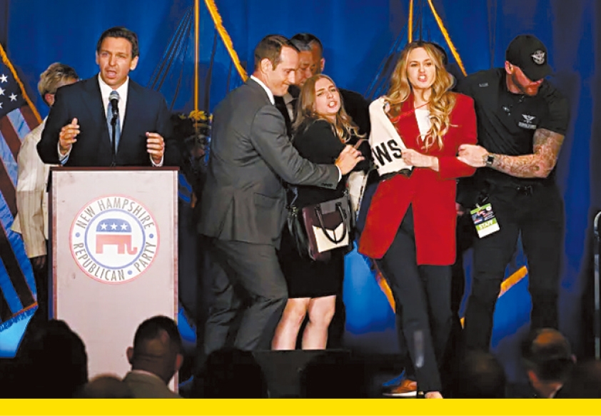 佛州州长德桑蒂斯(Ron DeSantis)前往早期初选重镇新罕布什尔州,协助当地共和党筹款,整场演说内容竞选意味甚浓,令人相信他不久后就会正式角逐2024年大选。但这次活动遭遇2名女示威者冲上讲台抗议,她们表示“犹太人反对德桑蒂斯”。