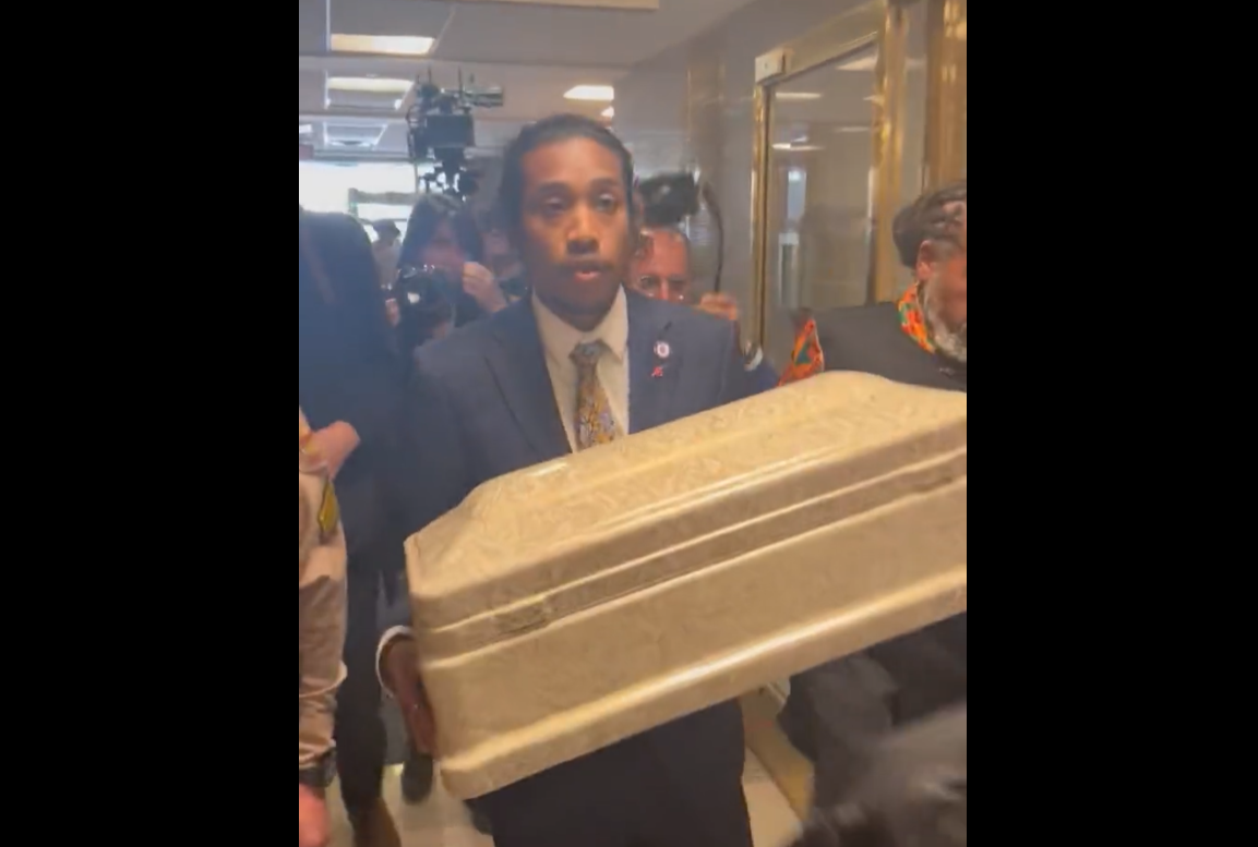 据美联社报道,当地时间17日,美国田纳西州民主党众议员贾斯廷·琼斯抬着一口小型“棺材”进入该州议会大厦,抗议枪支暴力导致美国民众死亡。此前,他曾因呼吁进行枪支管理改革遭田纳西州议会驱逐,引发民众示威。
