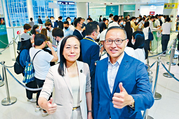 ▲飞扬1期减价推售余货,昨日亦出现大批买楼人潮,情况不俗。 图为长实杨桂玲(左)郭子威(右)。