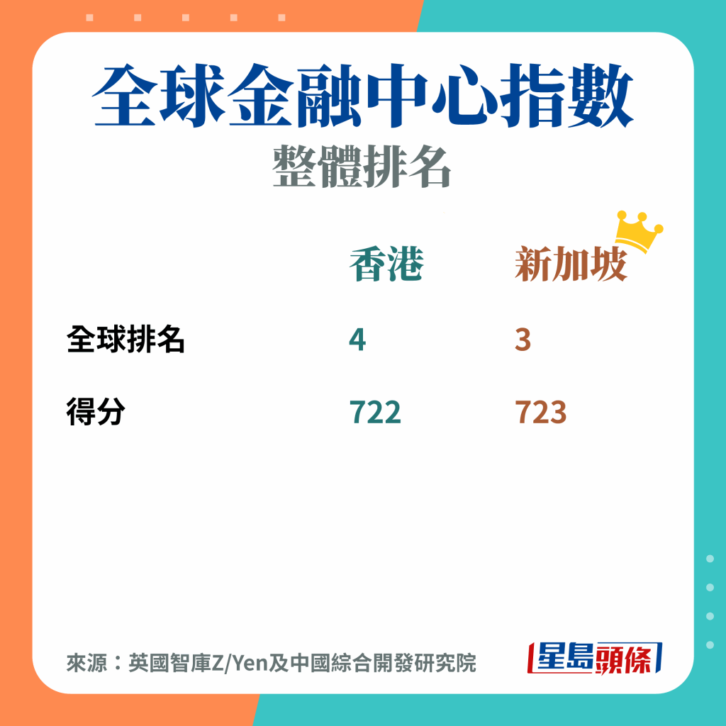 近期的金融地区排名中,尤以英国智库Z/Yen与中国综合开发研究院共同编制的全球金融中心指数(GFCI)最触目,新加坡已连续两度打低香港,进占全球金融中心三甲,令以往的“纽伦港”要改称“纽伦星”。