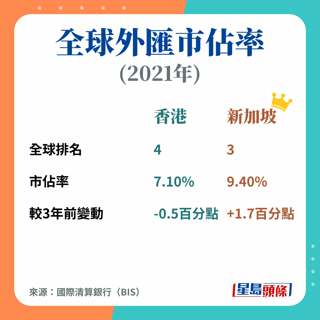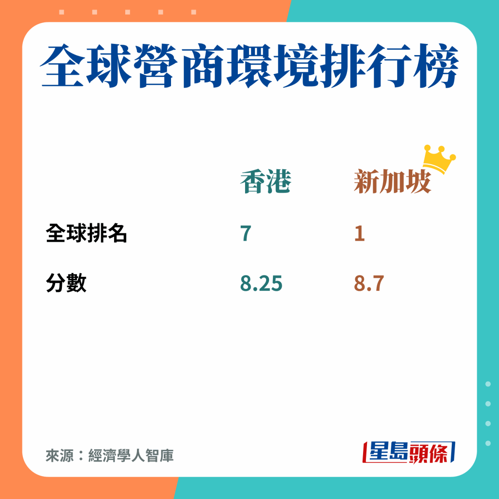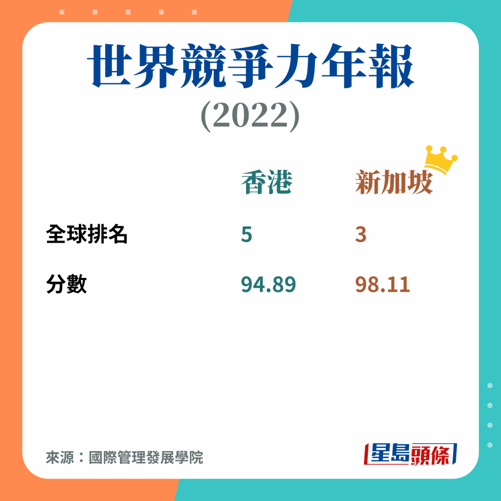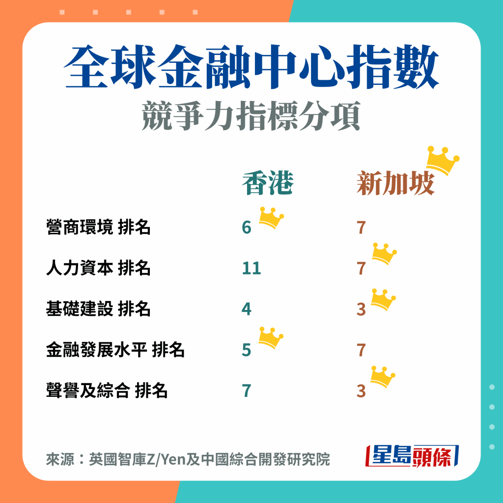 不过其实此研究亦颢示,港星只有1分的差距,各项评分亦各有千秋,例如竞争力指标排名中,香港的营商环境及金融发展水平都高过新加坡,至于人力资本、基建及声誉则稍逊;而以行业计,香港在银行及保险业都比新加坡具竞争力。
