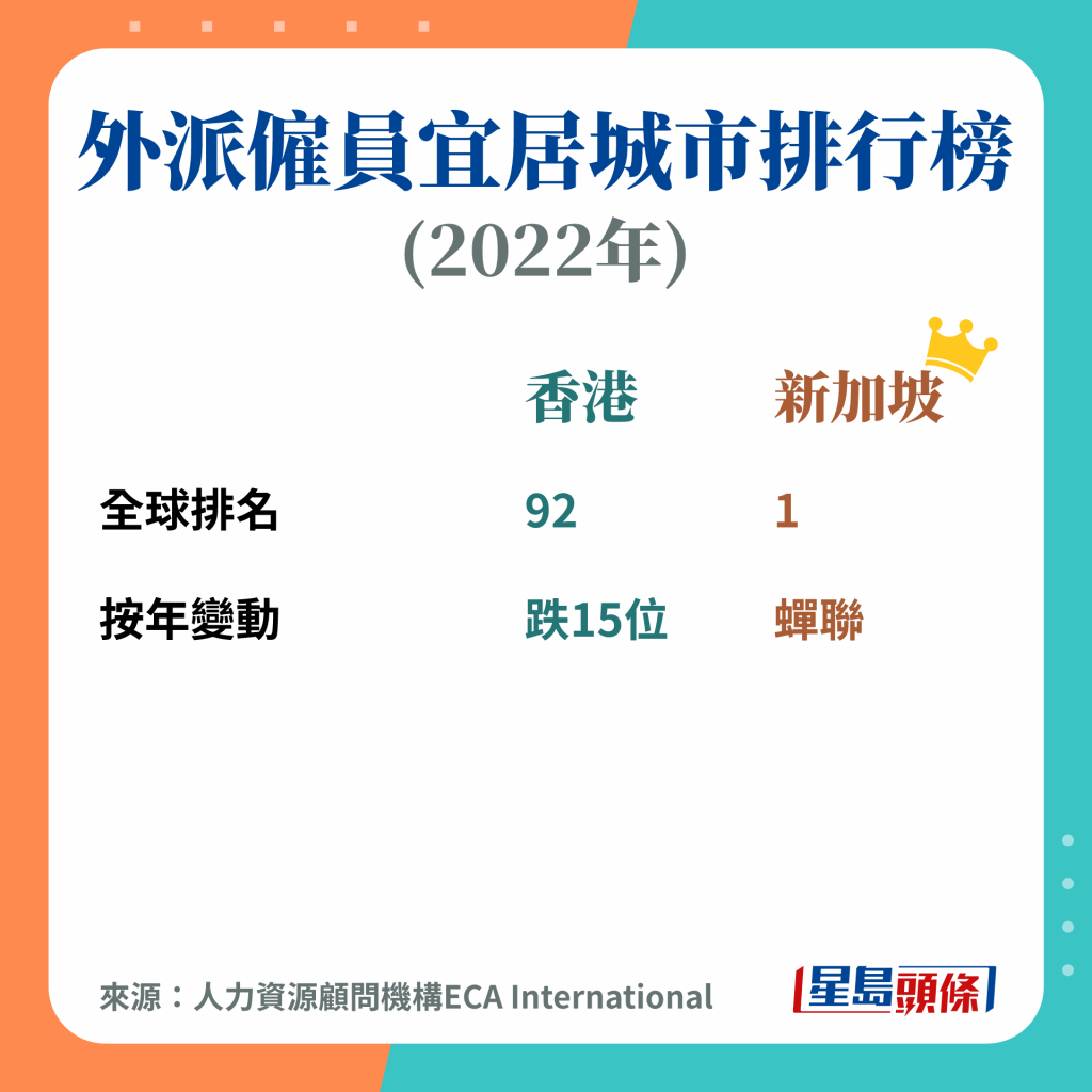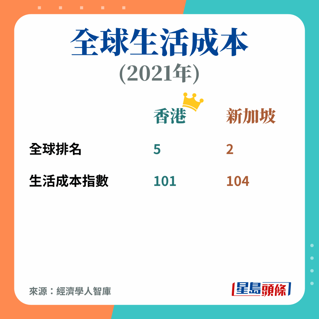 排榜首亦不一定好,由经济学人智库发表的《全球生活成本城市排行榜》,显示新加坡为全球最使费昂贵的城市,并纽约看齐,而香港居住负担相对较轻,排第四位。生活成本排行较高的城市,主要反映美国加息及供应链影响,特别是汽油价格、食品及公用事业等成本大增。