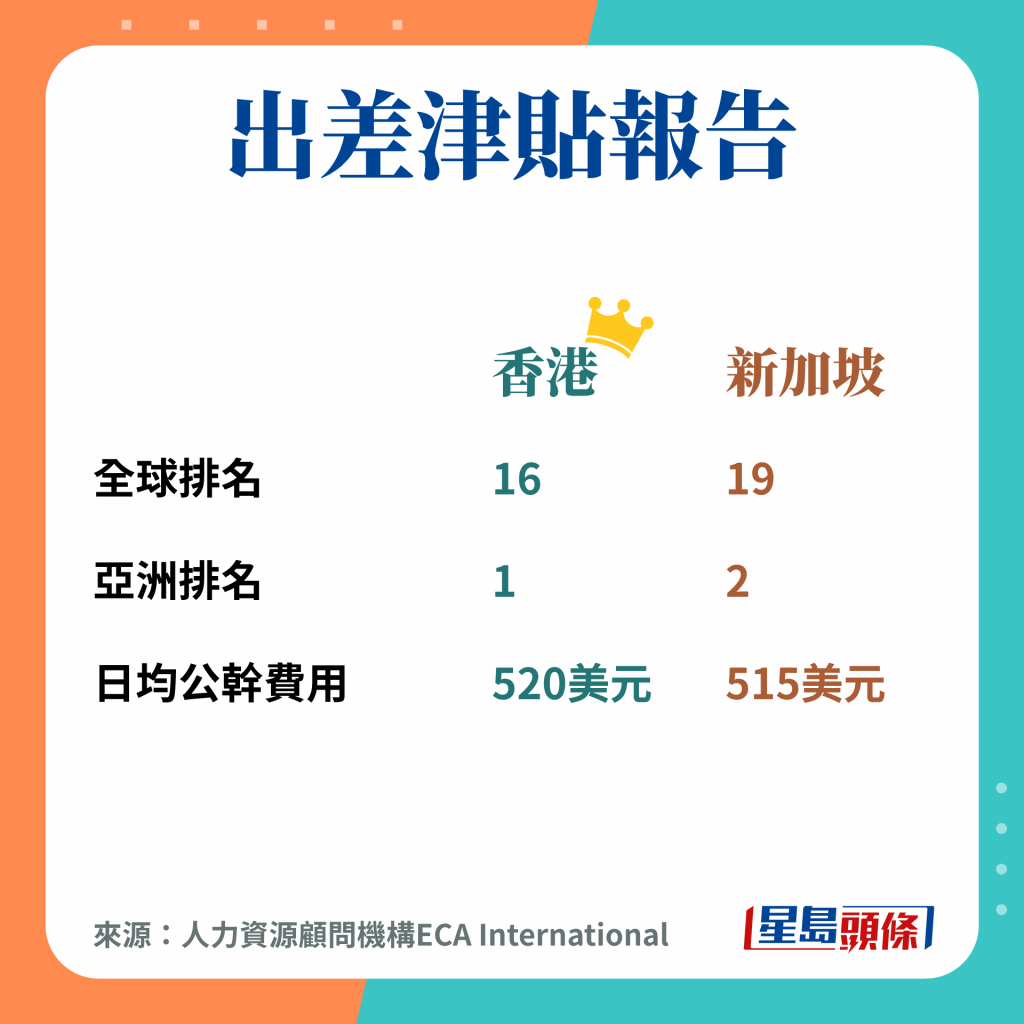 在一些商业机构制定的排行中,早前人力资源顾问机构ECA International公布的“外派僱员宜居城市排行榜”,由新加坡冧庄排榜首,香港则大跌至第92位。不过同一家机构的“出差津贴报告”就显示,香港仍然是亚洲最高的公干成本地区,高新加坡一位,海外打工仔来港公干平均支出每日520美元,包括酒店住宿、膳食、饮品、的士、日常必需品等开支,显示本港商务市场仍具竞争力。