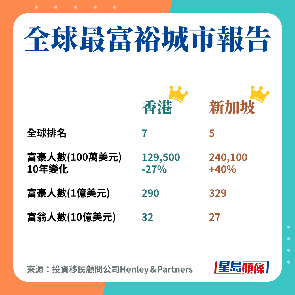 近期多个全球性排名香港都跑输新加坡,在金融中心地位、全球竞争力、营商环境等指标都被比下去,令人关注香港优势是否逐步削弱。不过其实仍有不少排名仍由香港占先,在生活成本、出差津贴等成功跑出,即使百万富豪人数有所落后,但顶级的亿万富翁仍略胜一筹。