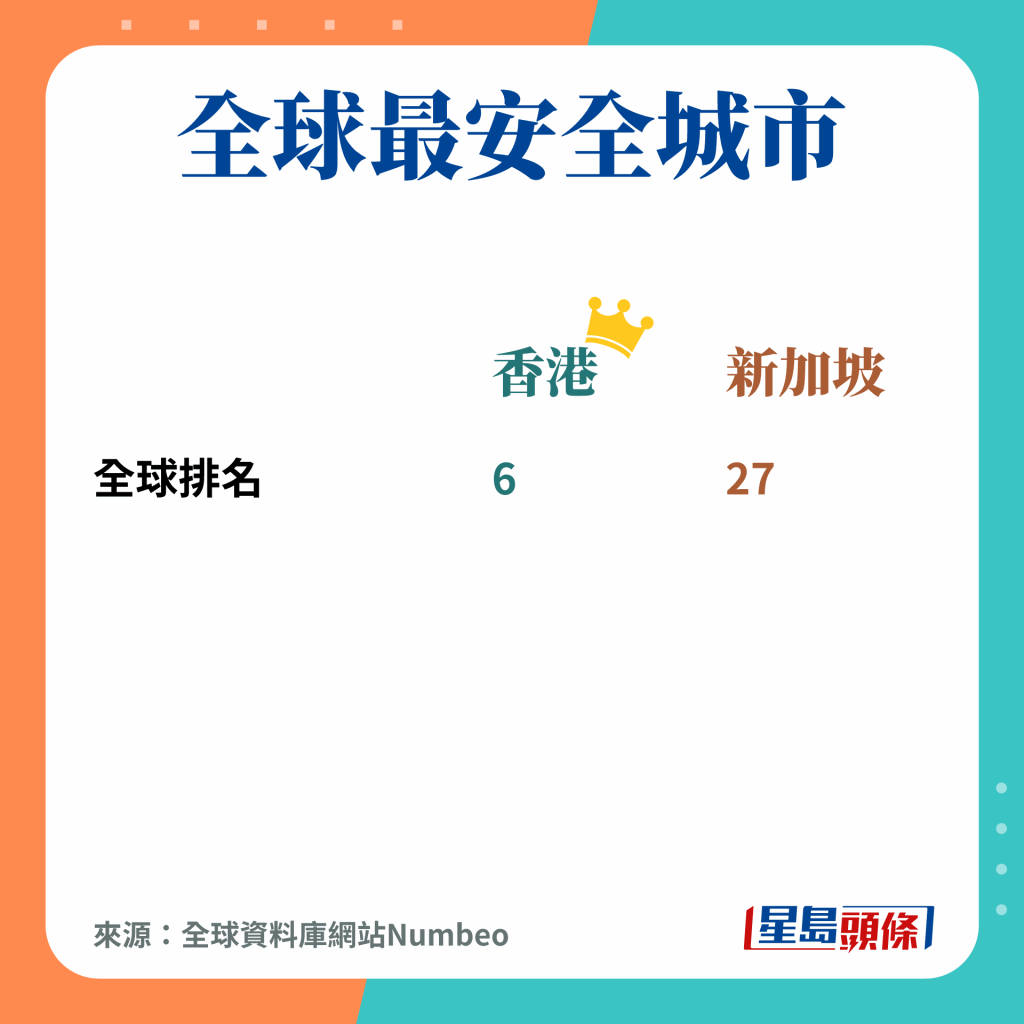 至于安全环境亦是重要因素之一,全球数据库网站Numbeo年初公布的《全球安全城市指数》中,香港排第6位,区内仅低于第3位的台湾,而新加坡在旅行人士的眼中,安全程度则排第27名。