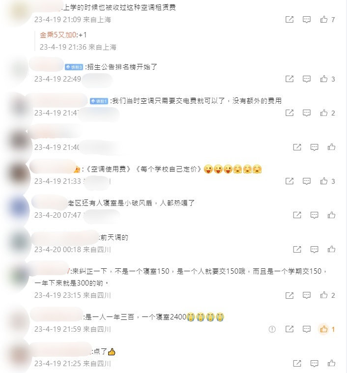 对于学校强收空调费,不少学生也产生共鸣,有人不以为然,觉得很正常,有人则大感无奈: