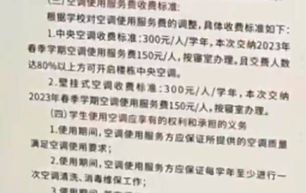该高校回应称,本学期收费已调整为以寝室为单位,即修学班空调服务费为300元/寝室,毕业生150元/寝室,空调开放时间根据实际天气适当调整。校方还表示不愿住空调寝室的学生,可调换到非空调寝室居住,则不必缴费。