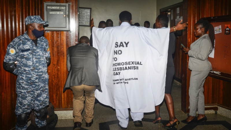 ▲2023年3月21日,乌干达议员穿着写上反性小众(LGBTQ)标语的白袍到国会为严厉的反同性恋法投票。 美联社