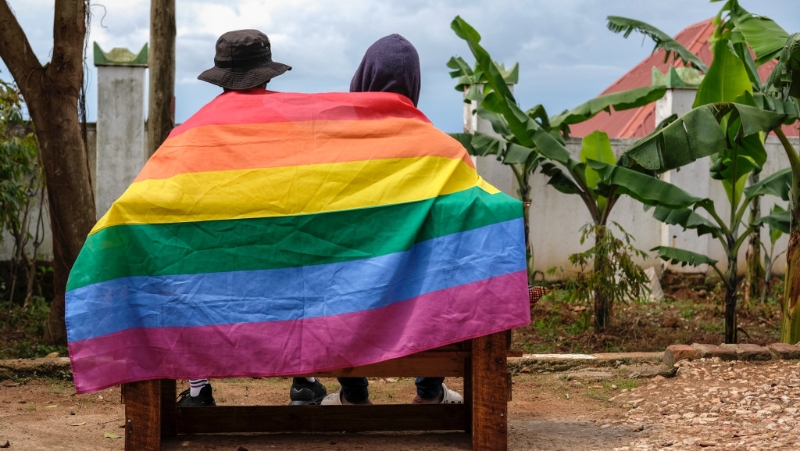 ▲一对乌干达同性恋人群披彩虹旗合照。 美联社