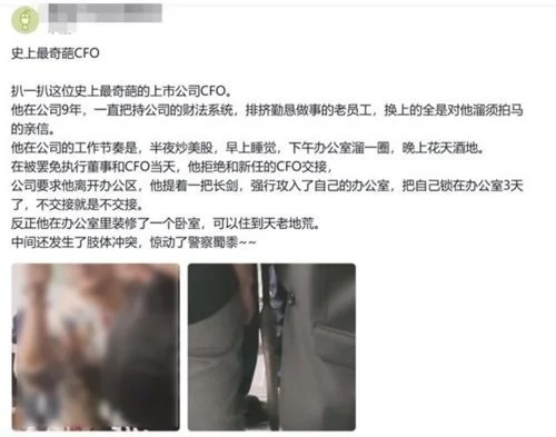 网上有人爆料,指徐翀是“史上最奇葩的上市公司CFO”,称他“半夜炒美股,早上睡觉,下午办公室溜一圈,晚上花天酒地”,又声称徐翀在宝宝树9年,“一直把持公司的财法系统,排挤勤恳做事的老员工,换上的全是对他溜须拍马的亲信”,并指他在办公室装修了一个卧室,可以住到地老天荒。