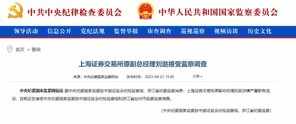 4月21日,中央纪委国家监委网站发布消息,据中央纪委国家监委驻中国证监会纪检监察组、浙江省纪委监委消息:上海证券交易所原副总经理刘逖涉嫌严重职务违法,目前正在接受中央纪委国家监委驻中国证监会纪检监察组和浙江省台州市监委监察调查。